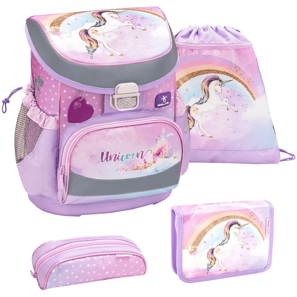 Belmil Schulranzen Mini Fit Schulranzen Set 4-teilig mit Brustgurt Rainbow Unicorn
