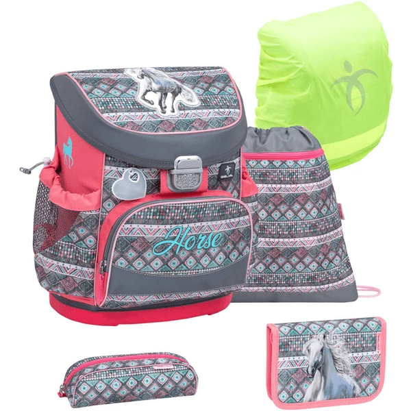 Belmil Schulranzen Mini Fit Schulranzen Set 5-teilig mit Brustgurt Horse Aruba Blue