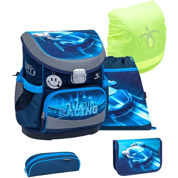 Belmil Schulranzen Mini Fit Schulranzen Set 5-teilig mit Brustgurt Racing Blue Neon