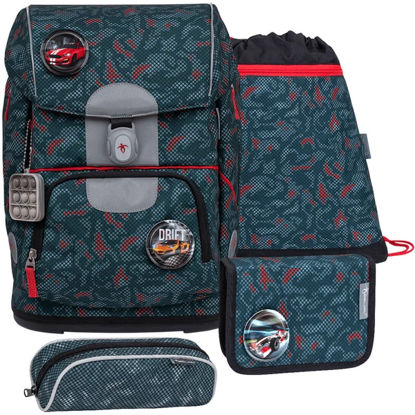 MOTION SET (405-74/S)Motion Schulranzen-Set enthält:- 1 Ergonomischer Schulranzen aus recyceltem Material- 1 Federmäppchen (leer)- 1 Schlampermäppchen – 1 Turnbeutel – 3 austauschbare Patches (3 Stück)- 1 Stundenplan- 1 Schlüsselbund • Funktionsweise: • Geeignet für die Grundschule für 6-9-Jährige• Maße: 35 x 27 x 20 cm • Volumen: 19 L • Gewicht: 1060-1120 g • Außenmaterial: recyceltes Material• Ausstattung: Ergonomisches Rückendesign, verstellbarer und leicht abnehmbarer Brustgurt und gepolsterter Hüftgurt, verstellbare Schultergurte, geeignet für A4-Format• Verschlussart: Einfach zu bedienende und reflektierende magnetische “PUSH”-Schließe • Großer Stauraum mit Kordelzug zur Fixierung des Inhalts, Vordertasche mit Thermofutter für Brotdose, Seitentaschen mit Reißverschluss (für Regenschirm oder Trinkflasche bis • Packungsinhalt: 1 Schulranzen; 1 Federmäppchen (leer); 1 Schlampermäppchen; 1 Turnbeutel; 3 Patches, 1 Stundenplan, 1 Schlüsselanhänger Ergonomie: • Ergonomische Form und atmungsaktive Rückenpolsterung für zusätzlichen Komfort • Gut gepolsterte Schultergurte, die an zwei Punkten verstellbar sind: oben und unten für perfekten Sitz • Für eine optimale Gewichtsverteilung ist die Tasche mit einem verstellbaren und abnehmbaren Brustgurt und einem gepolsterten Hüftgurt ausgestattet • Langlebigkeit:• Verstärkungen an allen Seiten und ein starkes Hartplastik-Bodenteil erhöhen die Stabilität und Haltbarkeit • Das Bodenteil hat noch weitere Funktionen: Es sorgt dafür, dass die Tasche in der gleichen Position bleibt und verhindert, dass sie schmutzig wirdDesign: • „Motion“ wird mit einem Set von 3 austauschbaren Klettverschlüssen geliefert, die an der Vordertasche, dem Deckel und dem Mäppchen befestigt werden können• Einzigartige und bunte Motive• Außenmaterial aus recyceltem Material• Entworfen und hergestellt in EuropaSicherheit:• Sorgfältig platzierte reflektierende Elemente auf allen Seiten, auf der Magnetschnalle, auf dem Deckel und der Vordertasche, auch auf den Schultergurten und dem HüftgurtGarantie:• 2 Jahre Garantie – Made in Europe • Familienbetrieb in 3. Generation seit 1965